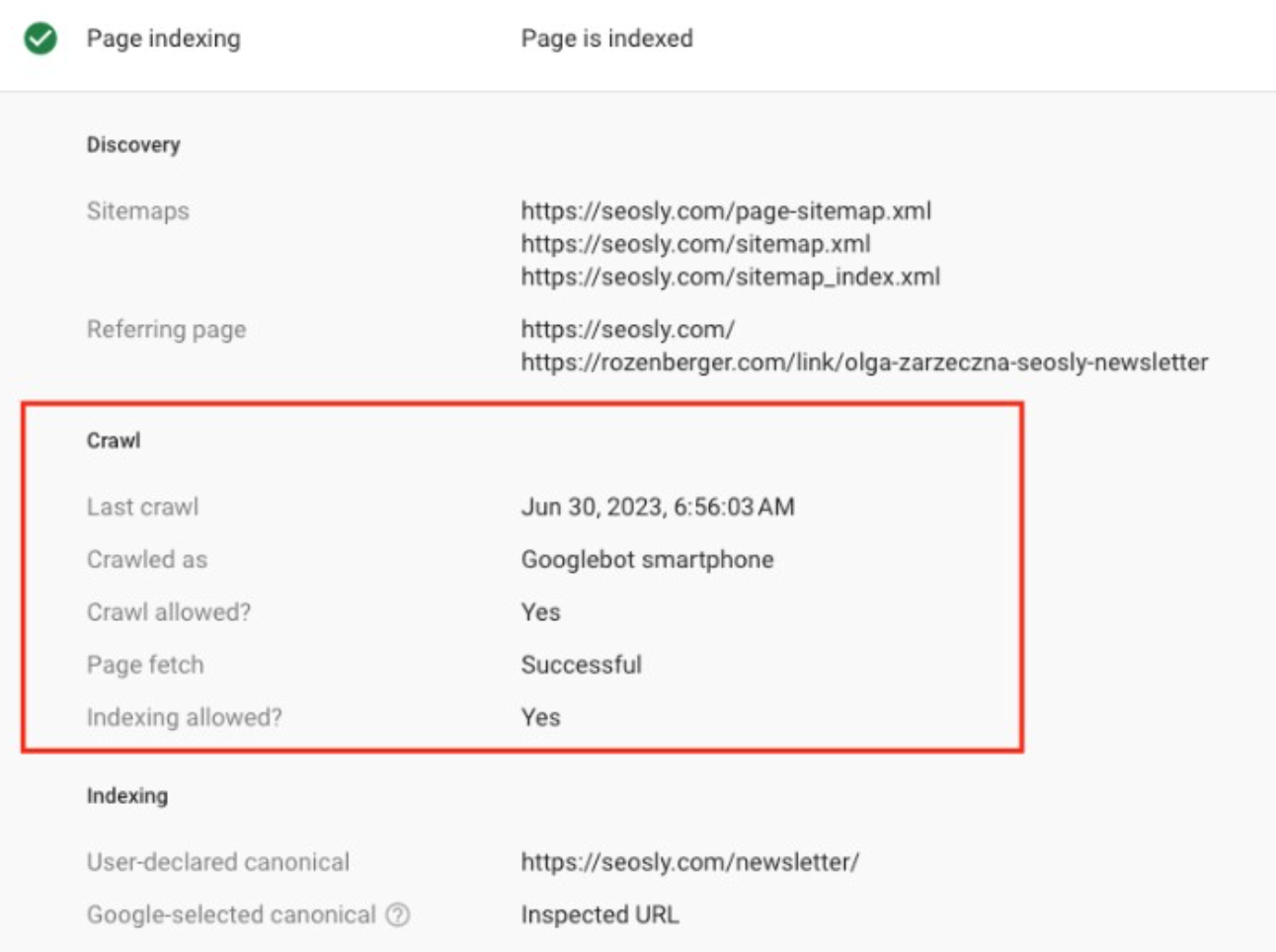 - '페이지 색인 생성' 섹션에는 페이지가 마지막으로 크롤링된 시기와 색인 생성 여부가 표시됩니다.