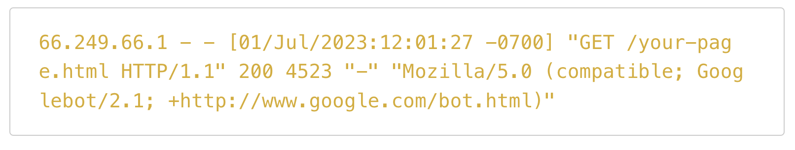 - 66.249.66.1: 요청하는 IP 주소입니다. Google은 웹을 크롤링하는 데 사용하는 다양한 IP 주소를 보유하고 있으며 이 주소는 알려진 Googlebot 주소입니다.